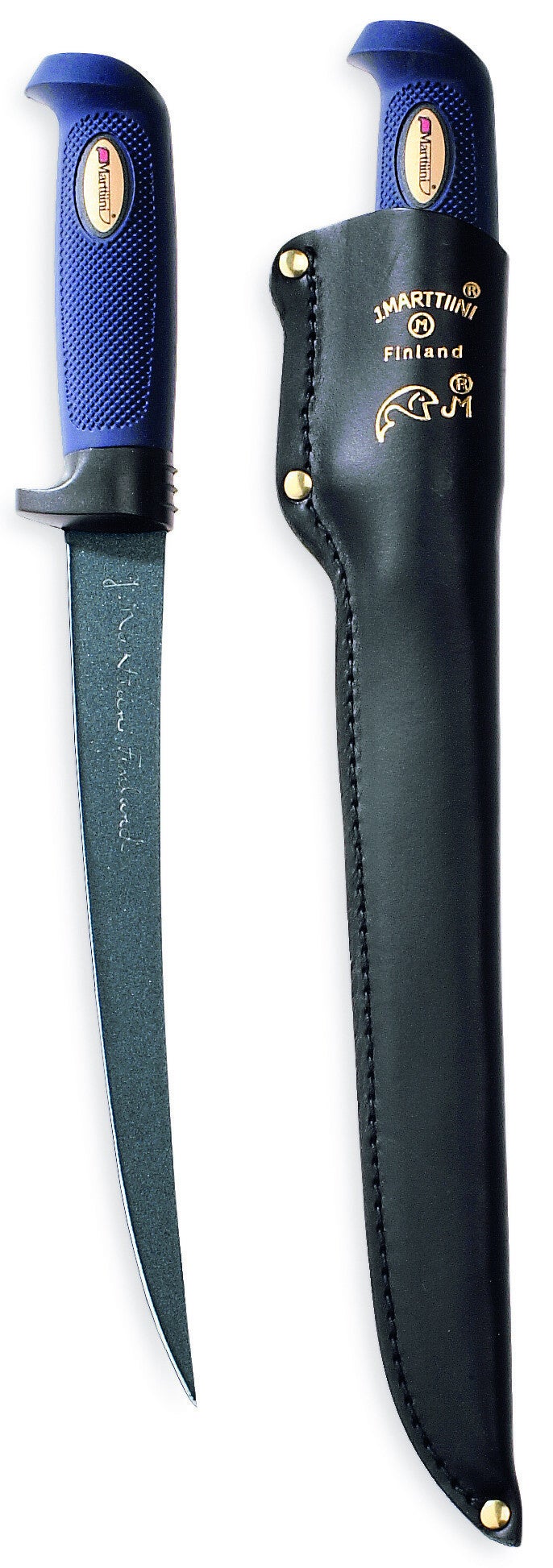 De Martef-coating vermindert de wrijving vrijwel tot niets en beschermt het blad tegen corrosie. Het reinigen van het mes na gebruik is uiterst eenvoudig. Het opgeruwde rubberen handvat en de vingerbeschermer zorgen ervoor dat het mes ook onder moeilijke omstandigheden stevig in de hand ligt. Deze lemmetlengte is geschikt voor de grootste kanjers. Het fileermes wordt geleverd met een leren schede.