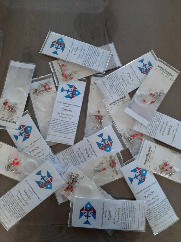 Dé befaamde Visservice's Krijnlijn.De beste Makreel,- en Haringlijn ooit. In het water imiteert deze lijn, of eigenlijk de haken zelf, kleine kreeftjes of kril. Je zou zelfs kunnen denken aan zalmeitjes of klein aas. Doordat de haken vrij kunnen bewegen in een lus, valt er zo goed als geen enkele vis van de haken tijdens het binnenhalen. Groot voordeel van deze lijnen, ze raken nooit in de knoop. Zeer geschikt voor haring, makreel en jonge rondvis. Specificaties van de onderlijn: Haakmaat 3/0, lengte 150 cm, tussenruimte 25 cm, 5 haken, lijndoorsnede 0,80.