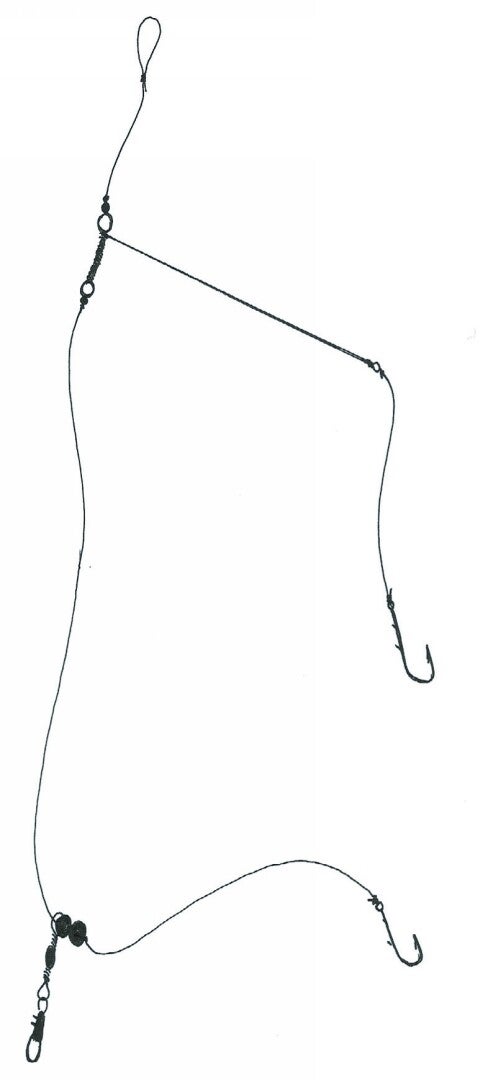 Verkrijbaar 3 haakmaten, 2 haken per lijn, hoofdlijn 0.65, zijlijn 0.60, lengte 150 cm.