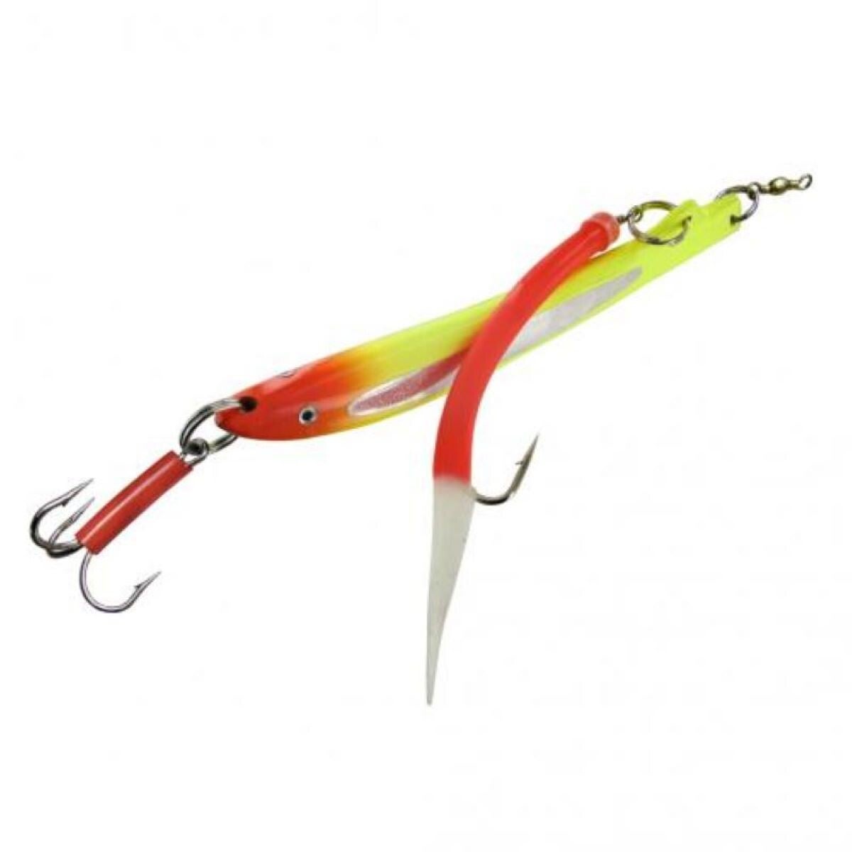 Bananenpilker met rubberen Makk is een absoluut succesaas door de bijzondere vorm van deze pilker. De combinatie met de gummiemak maakt deze pilke extra aantrekkelijk. Daarnaast valt de pilker extra op door de lichtgevende en sterk reflecterende kleurkeuze (zilver, lichtgevend/oranje). Voorzien van supersterke splitringen en haken maakt dat deze pilker een ideale keuze is voor het vissen op diep water.