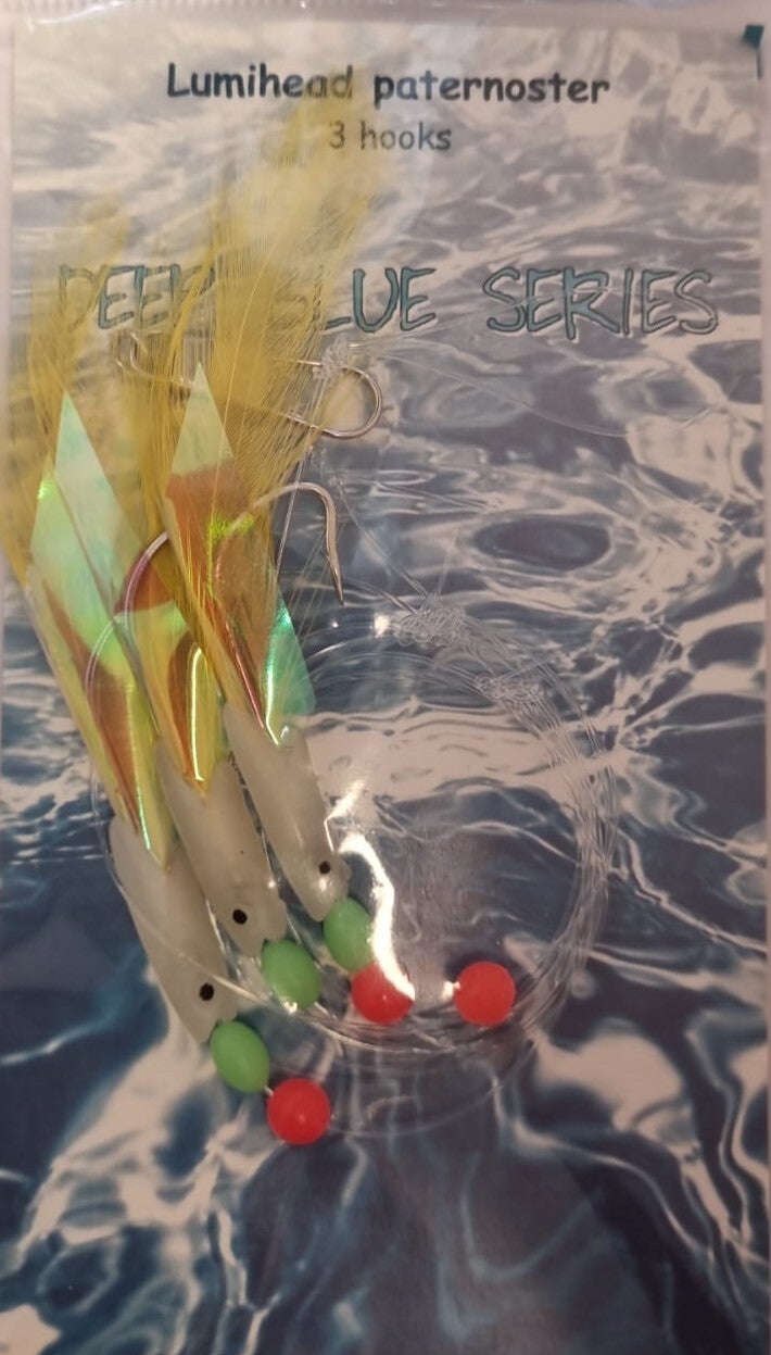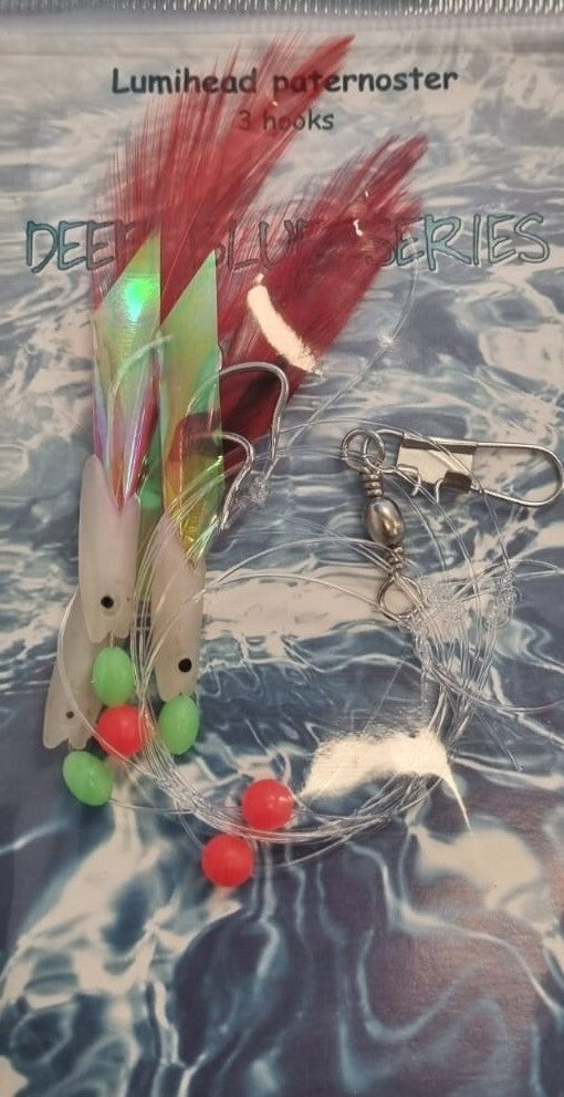 De klassieke verenpaternoster met een modern tintje. Door de combinatie van de lumihead vissekopjes gecombineerd met veren en kralen krijg je een heel aantrekkelijk onderlijn voor makreel. Verkrijgbaar in 3 kleuren, haakmaar 1/0, 3 haken, hoofdlijn 0.60 mm, zijlijnen 0.45 mm.